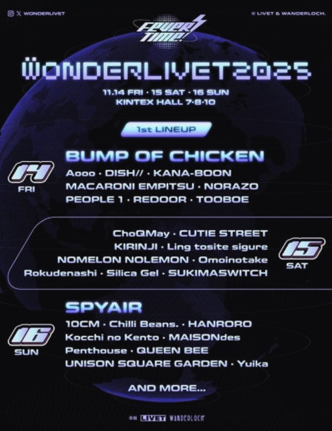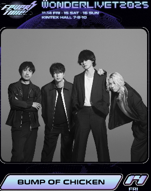 일본 록밴드 BUMP OF CHICKEN은 독창적인 사운드와 세련된 멜로디, 섬세한 가사로 수많은 팬들의 사랑을 받고 있는 그룹입니다. 2025년 11월 14일 금요일 킨텍스 홀에서 열리는 원더리벳 2025에 헤드라이너로 참여가 확정되었습니다.