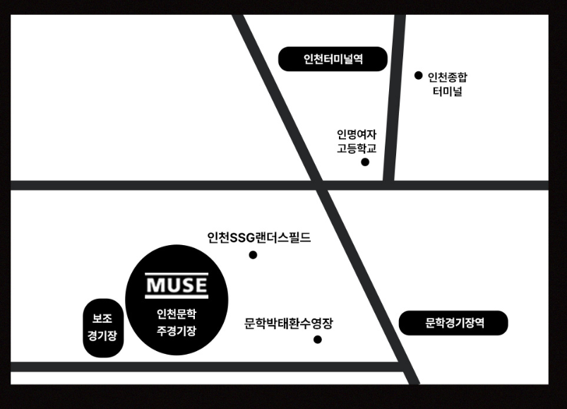 인천 1호선 문학경기장역 1,2번 출구에서 도보로 10분 거리입니다. 지선버스는 515, 520,522,523/ 간선버스는 4,5,6-1,11,46,55,63,82,111-2 등이 있습니다. 단, 당일 인근 주차장이 조기 마감될 수 있으므로 대중교통 이용을 강력 추천드립니다.