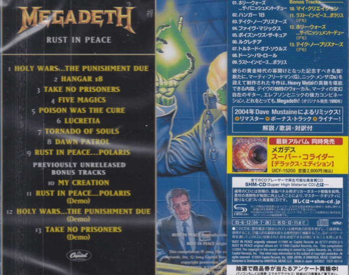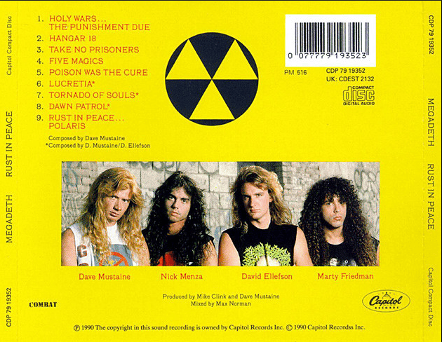 1990년 발매된 메가데스의 4집 Rust in Peace는 총 9곡으로 구성되어 있습니다. 미국에서만 백만장을 판매하여 플렌티넘 레코드를 획득했으며 캐나다, 영국, 일본, 아르헨티나 등에서 골드 이상의 판매를 기록하였습니다. 데이브 머스테인의 작곡 실력과 마티 프리드먼의 강력함과 동양적인 서정미가 듬뿍 담긴 기타 연주가 결합된 스래쉬 메탈의 완성작으로 평가받고 있습니다. 베이스는 데이비드 엘렙슨, 드럼은 닉 멘자로 이들의 최전성기시절이 시작되는 멤버들입니다. (멤버 변동이 참 많은 밴드이기도 합니다.)각 곡마다 독특한 주제와 메시지를 담고 있어 메탈 팬들의 필청 앨범입니다.